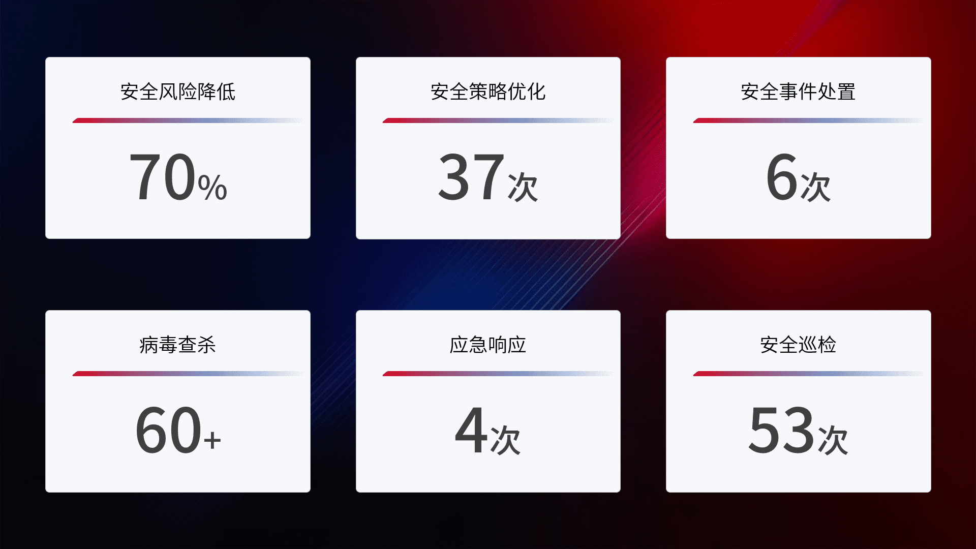 提供全面的安全事件报告体系,,包括处置报告、、周报、、、、季度和年度总结,,,,结合持续监控,,,,帮助客户深入了解网络安全状况。。。。